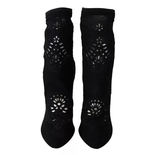 Dolce & Gabbana Black Floral Stretch Mid Calf Boots Shoes
