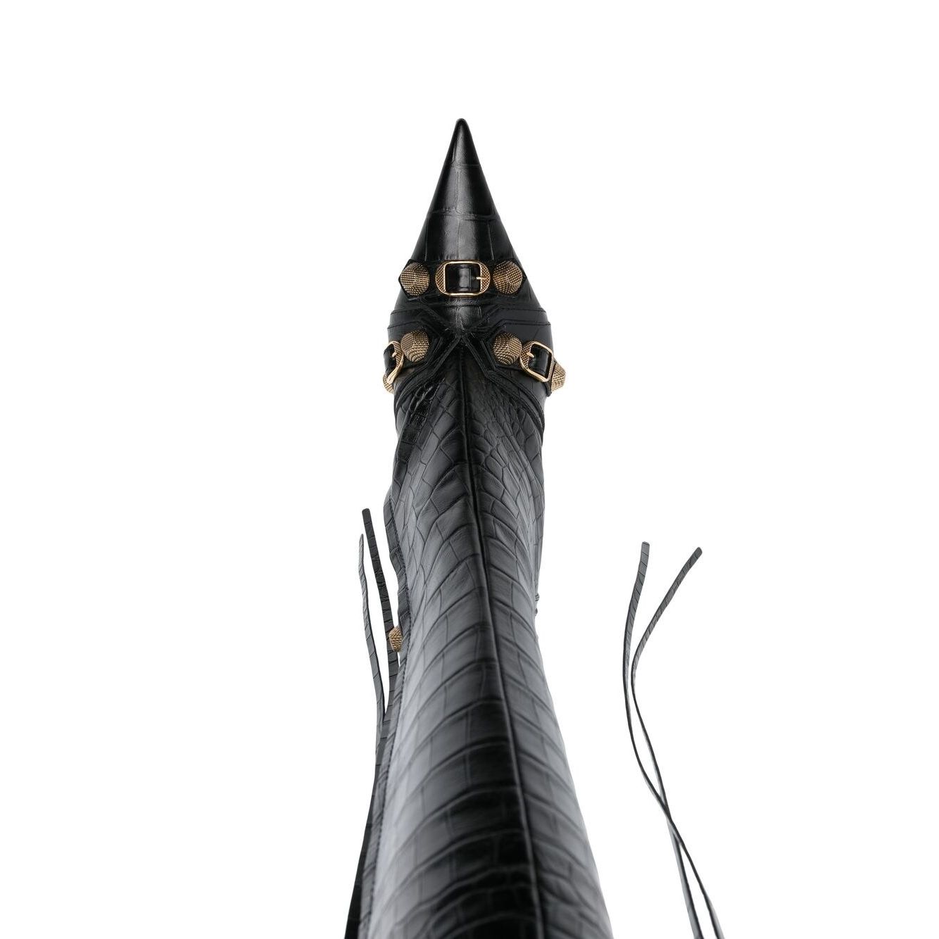 Cagole 90mm pointed-toe boots from BALENCIAGA featuring black, calf leather, embossed crocodile effect, bronze-tone hardware, pointed toe, knee-length, side zip fastening and high heel. Conscious: We've partnered with Good On You – an ethical agency that rates how sustainably brands perform. This item comes from a brand that performs well in relation to their impact on the planet.. Le Cagole leather heel boots Size and Fit - Heel 3,5 in / 9 cm