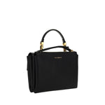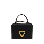 Calfskin Arlettis Handbag by Coccinelle, rigid leather top handle, removable and adjustable flat shoulder strap, contrasting applied brand monogram plaque on the back, front flap closure with gold-plated metal interlocking system, garnet leather design, second compartment on the back with top zip for closure.