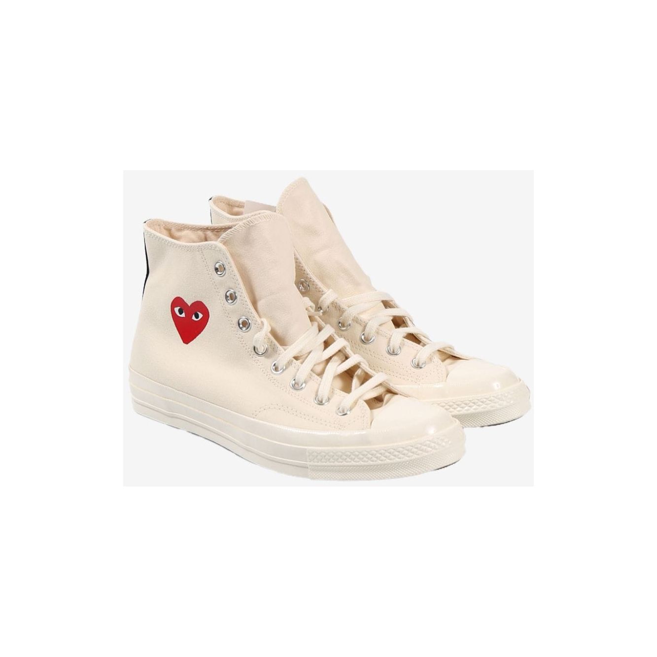 Beige canvas front lace-up fastening branded heel counter contrasting heel counter signature heart print rubber sole round toe. Chuck Taylor high-top sneakers Size and Fit - Heel 1,2 in / 3 cm; Platform 1 in / 2,5 cm