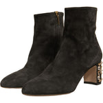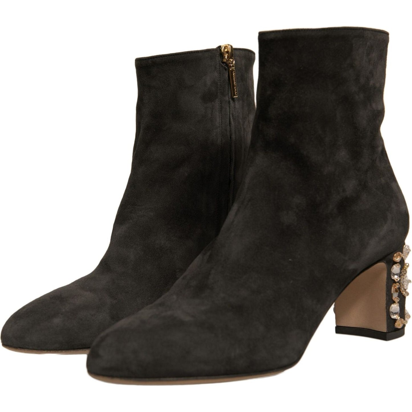 Gorgeous brand new, 100% Authentic Dolce & Gabbana black embellished heel ankle boots are crafted from leather and suede and feature an almond toe, an ankle length, a side zip fastening, a mid high block heel and crystal embellishments.