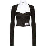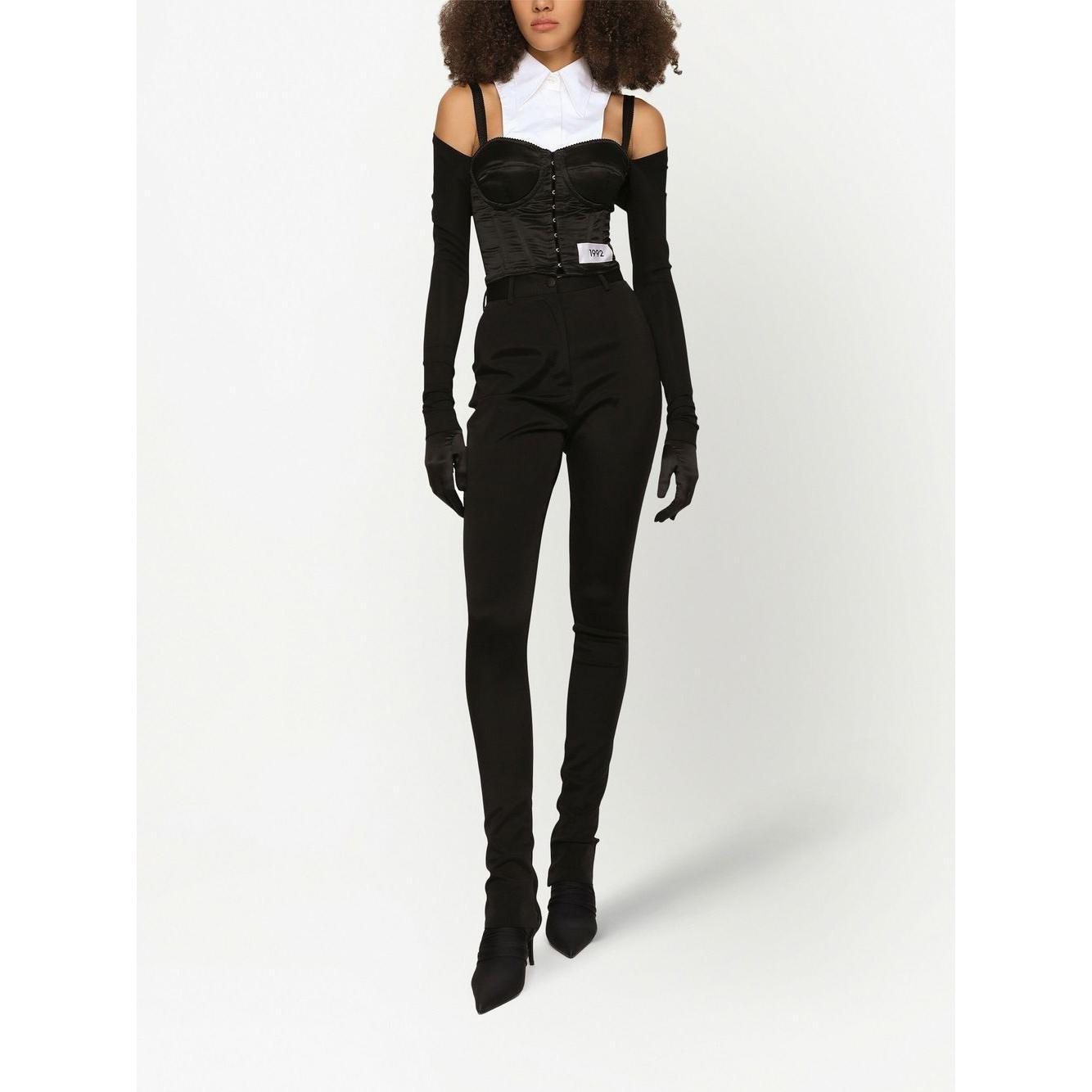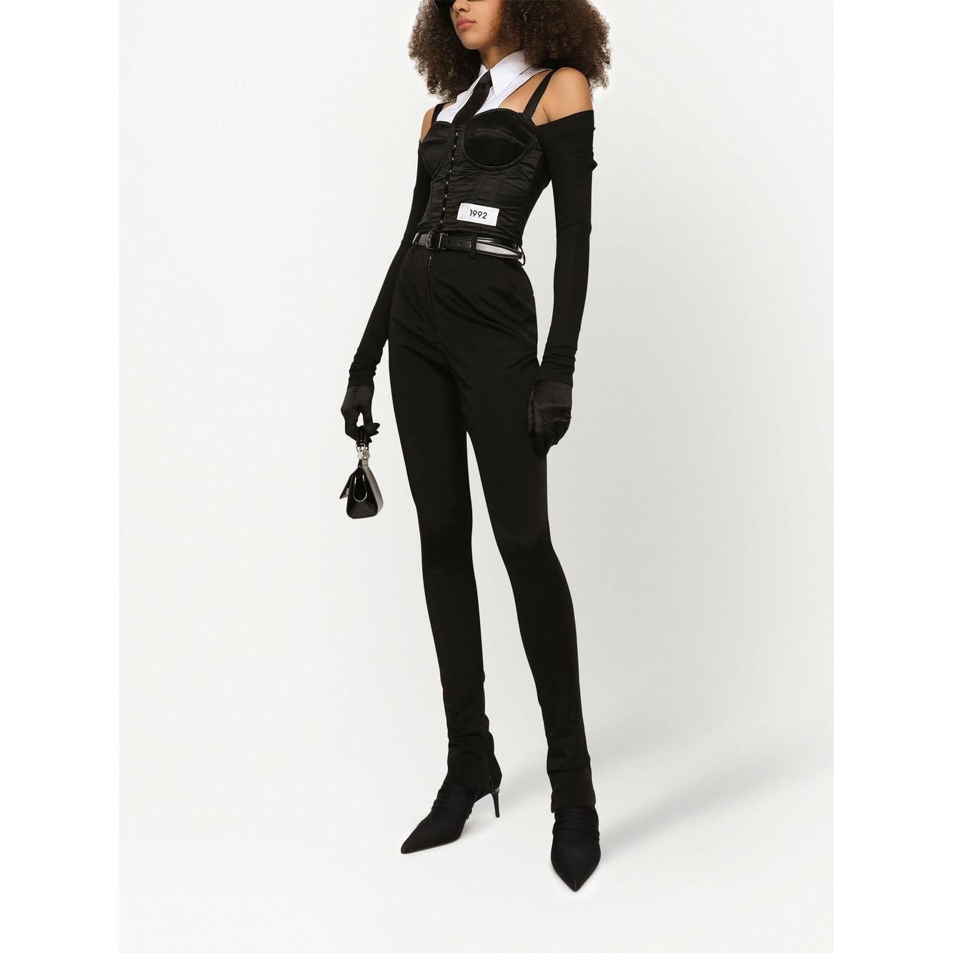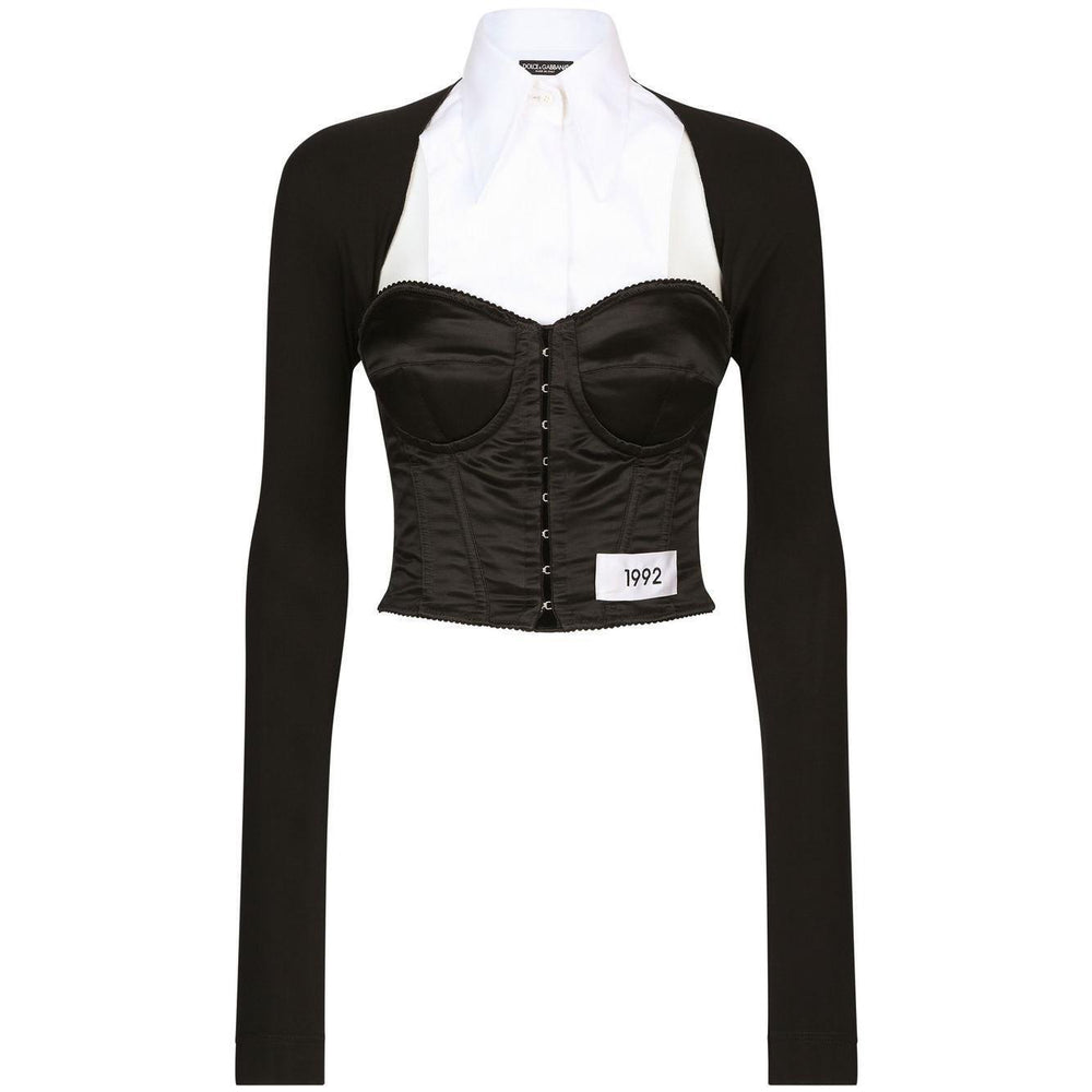 KIM DOLCE&GABBANA layered-shirt corset top from DOLCE & GABBANA featuring black, cotton blend, layered effect, corset style, oversized pointed collar, moulded cup, corset style, number patch to the front, boned bodice, front hook and eye fastening and long sleeves. Layered-shirt corset Size and Fit - This piece fits true to size. We recommend you get your regular size. Model is 1,75m / 5ft 8in wearing size 40 (IT)