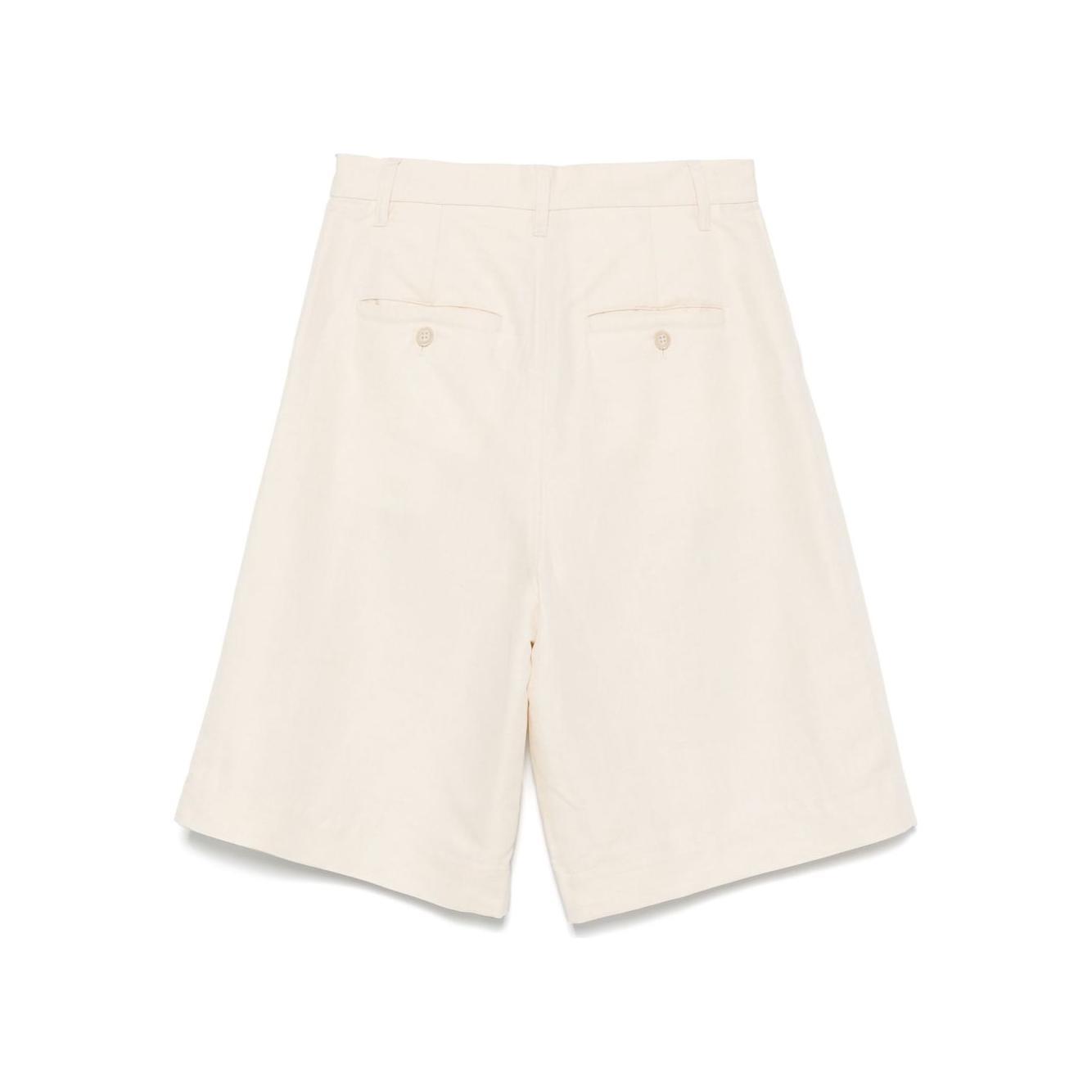 light beige front button and zip fastening belt loops two side slash pockets two rear welt pockets Linen and cotton blend shorts Size and Fit - This piece fits true to size. We recommend you get your regular size. Model is 1,75m / 5ft 8in wearing size 36 (FR)