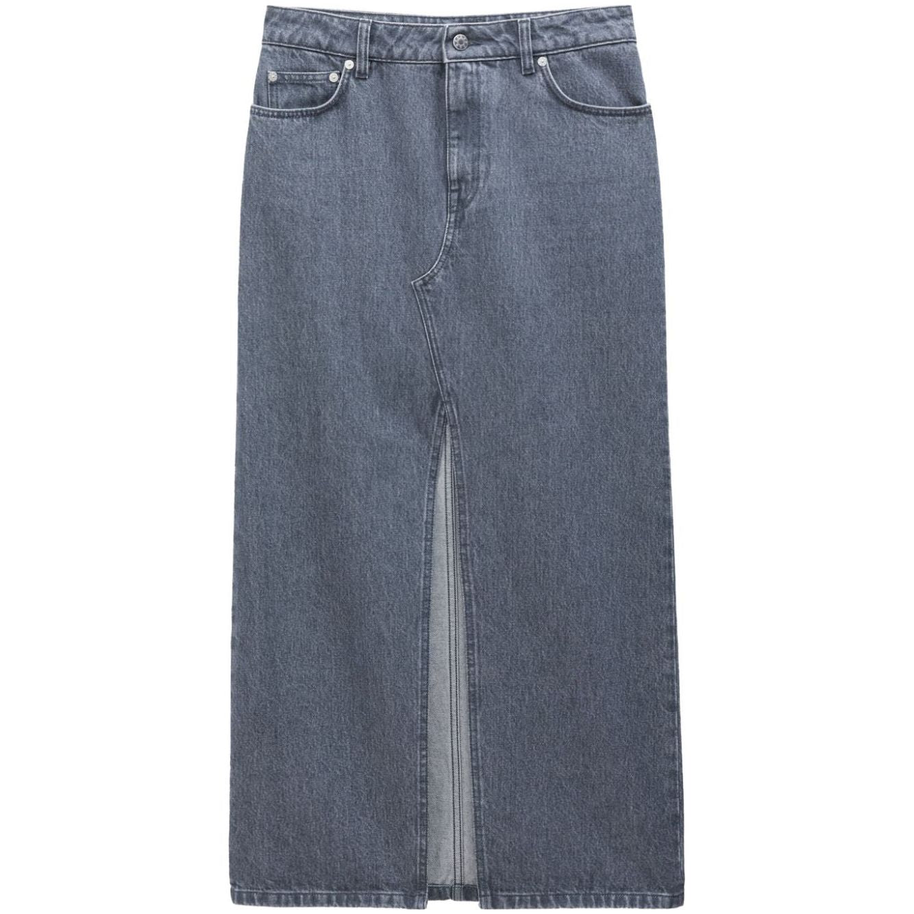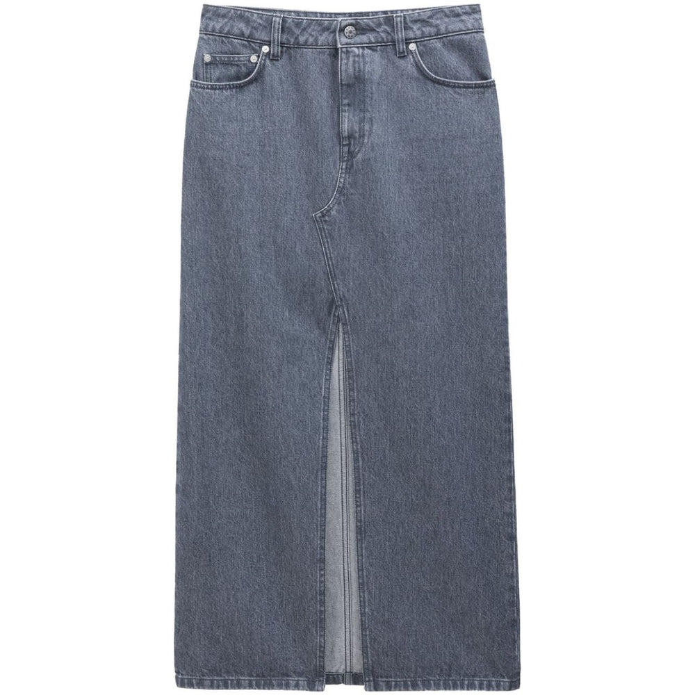 grey organic cotton denim appliqué logo front slit belt loops front button fastening classic five pockets maxi straight hem This item is made from at least 50% organic materials. Learn more about what makes a product Conscious on our Conscious Criteria page Slit denim long skirt Size and Fit - This piece fits true to size. We recommend you get your regular size. Model is 1,75m / 5ft 8in wearing size 36 (FR)