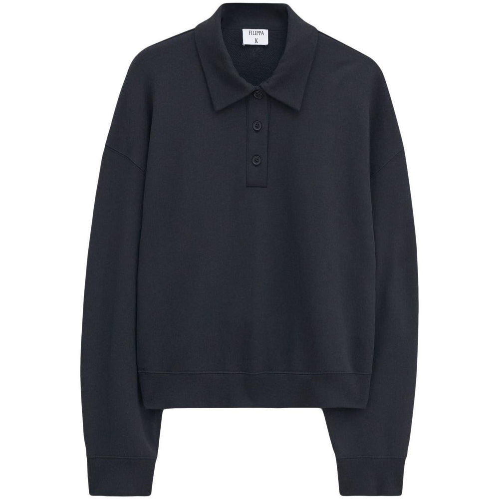 black organic cotton blend jersey texture front button placket polo collar drop shoulder long sleeves ribbed cuffs and hem Long sleeves polo shirt Size and Fit - This piece fits true to size. We recommend you get your regular size. Model is 1,75m / 5ft 8in wearing size S