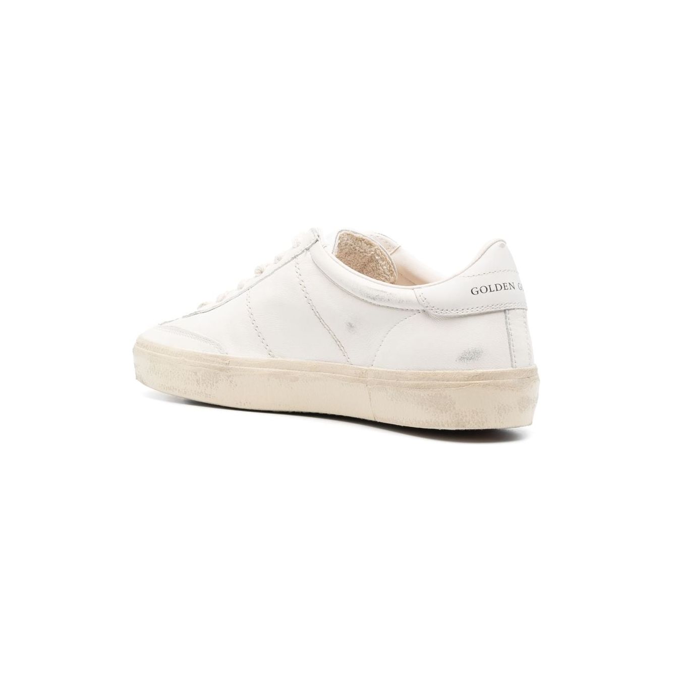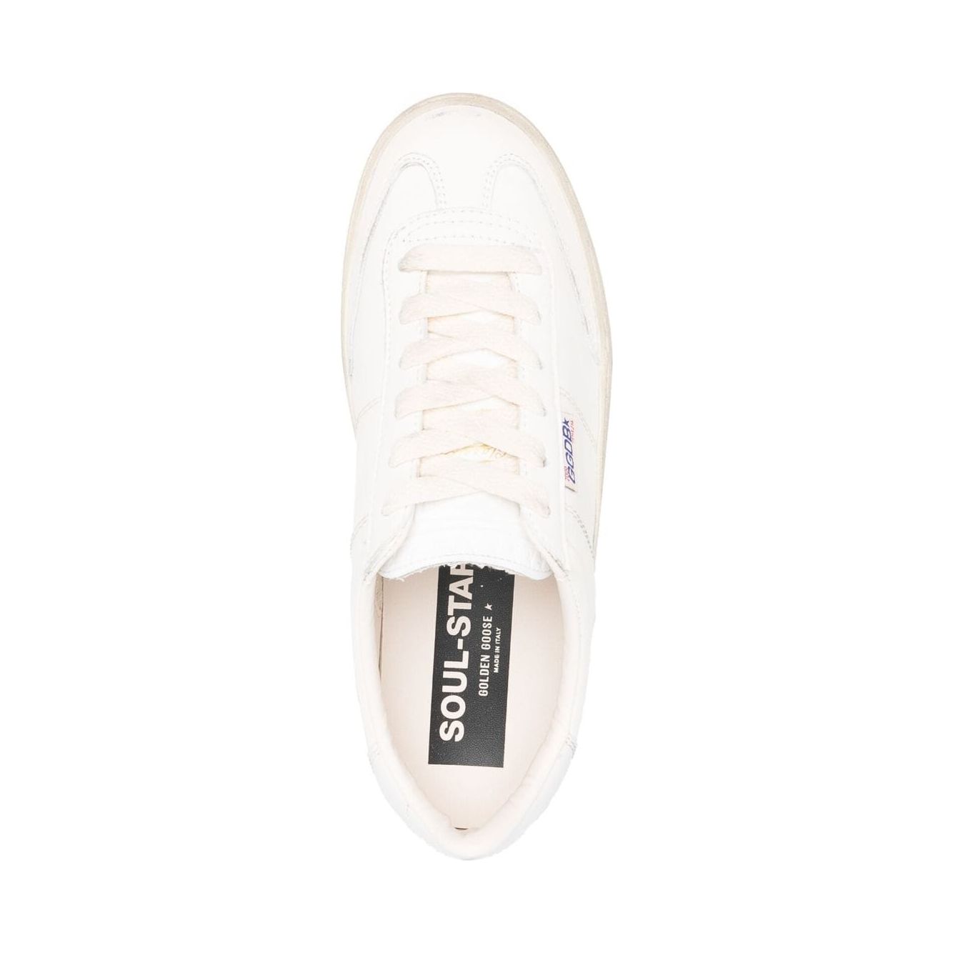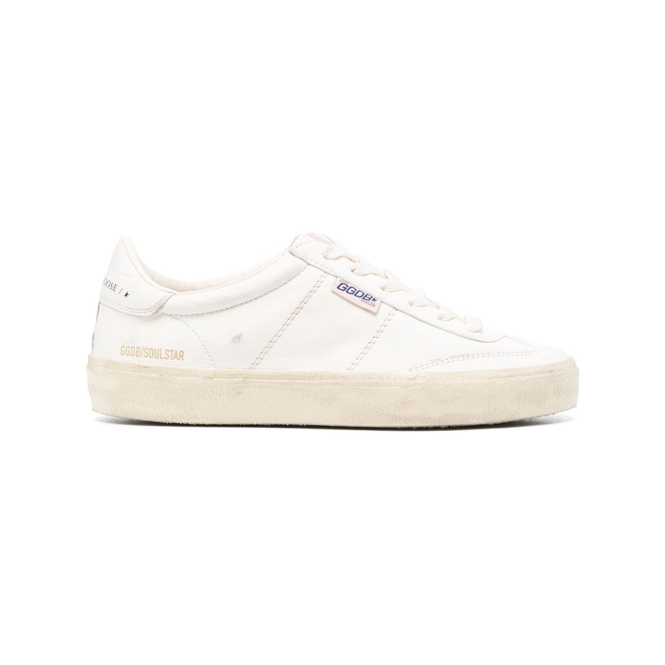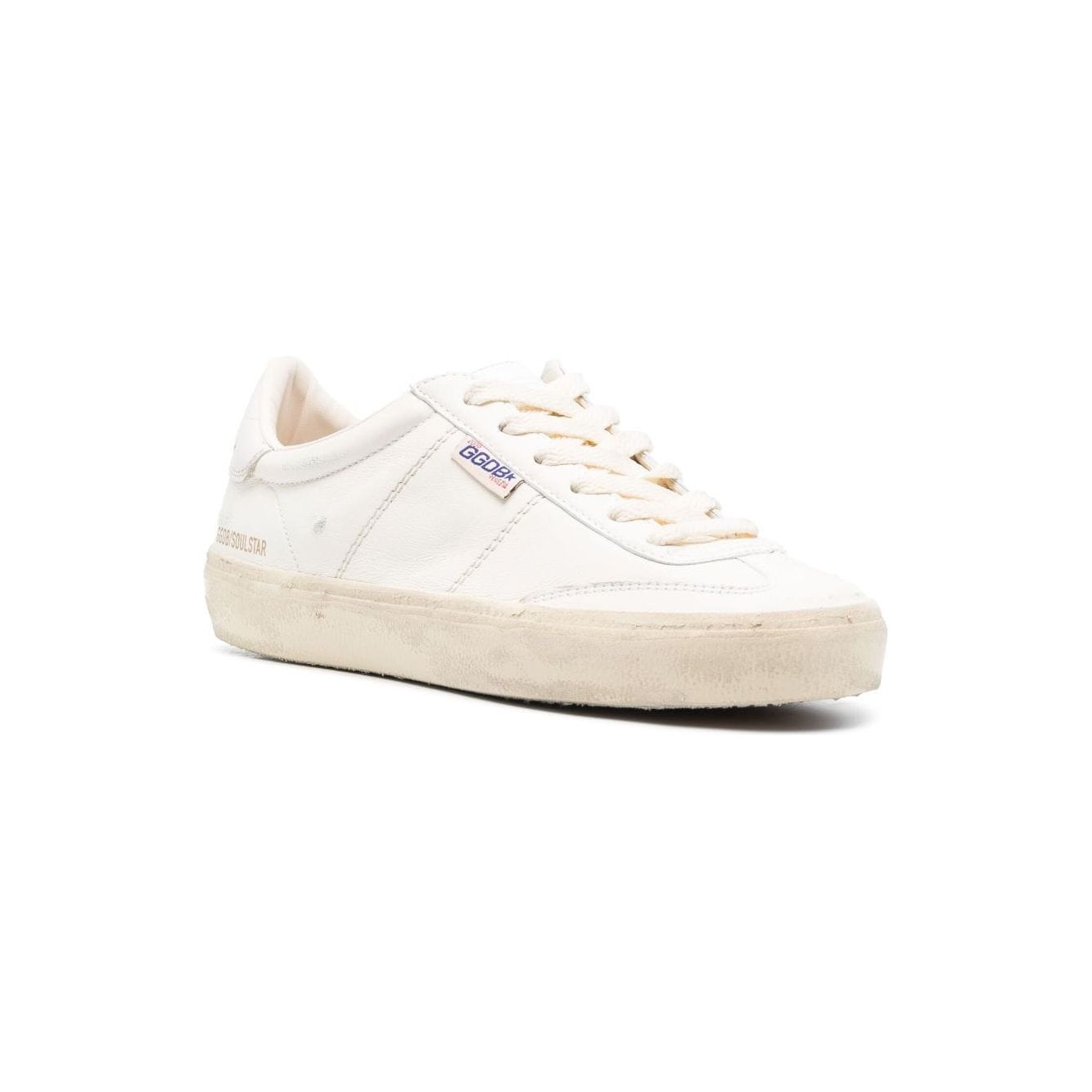 white calf leather distressed effect logo print to the rear logo print to the side logo patch to the side decorative stitching branded insole logo-print tongue front lace-up fastening round toe flat rubber sole Soul Star leather sneakers Size and Fit - Heel 1,4 in / 3,5 cm Platform 0,8 in / 2 cm