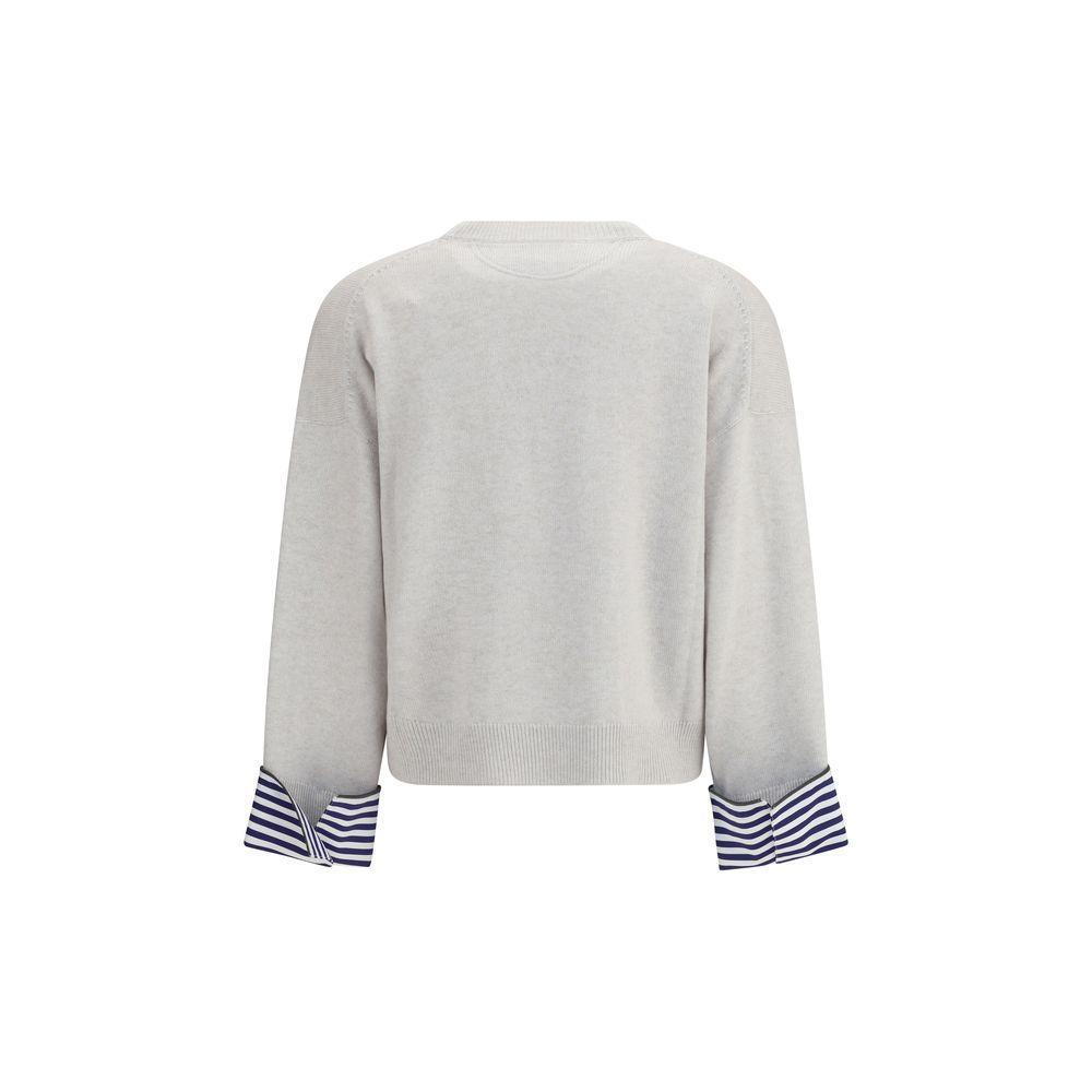 Brunello Cucinelli’s cashmere Sweater combines the softness of knitwear with refined tailoring details. Featuring a ribbed crew neck and hemline, it is distinguished by cuffs with a striped shirting fabric insert, embellished with iconic shiny jewels. A versatile and elegant garment that stylishly interprets the concept of understated luxury.