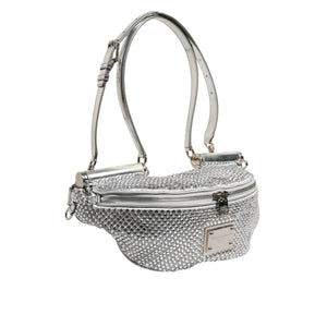 Gorgeous brand new, 100% Authentic Dolce & Gabbana Silver calf leather belt bag featuring crystal embellishment, silver-tone hardware, logo plaque, single flat top handle, adjustable waist strap, adjustable detachable shoulder strap, front zip fastening, main compartment and internal slip pocket.
