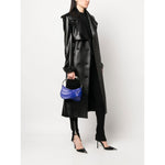 small Spiral Curve 01 embossed tote bag from MUGLER featuring electric blue, calf leather, embossed detail, silver-tone logo lettering, single metallic top handle, top zip fastening, main compartment and detachable shoulder strap. Spiral Curve 01 small shoulder bag Size and Fit - Width 9,45 in / 24 cm