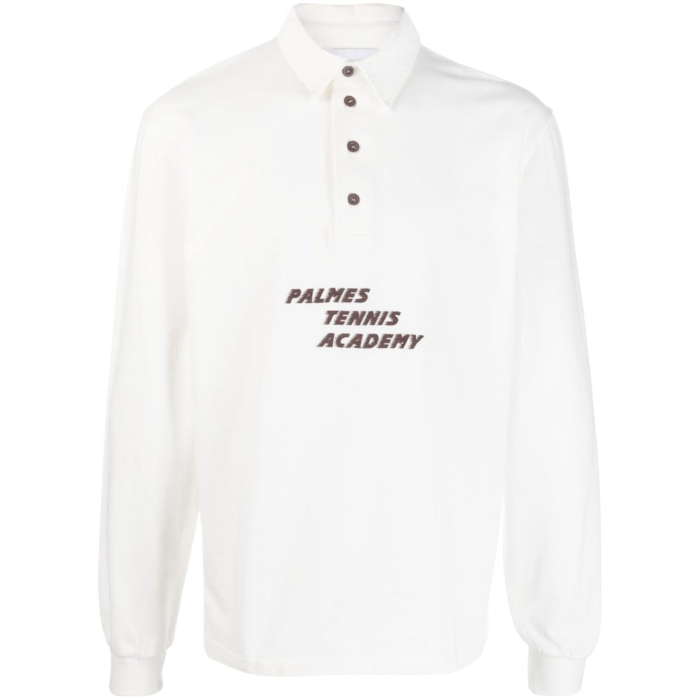 logo-print button-up sweatshirt from Palmes featuring ivory white, organic cotton, logo print to the front, classic collar, front button placket, long sleeves, elasticated cuffs and straight hem. This item is made from at least 50% organic materials.. Learn more about what makes a product Conscious on our Conscious Criteria page. Organic cotton long sleeve shirt Size and Fit - This piece fits true to size. We recommend you get your regular size. Model is 1,84m / 6ft 1in wearing size M