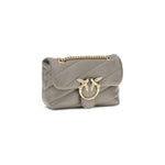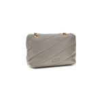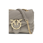 Calfskin Love Baby Shoulder Bag by Pinko, front closure with magnetic button, iconic gold-plated Love Birds logo embossed on the front, quilted and padded design, double internal compartment, sliding chain shoulder strap, iconic brand monogram embroidered tone-on-tone on the back.