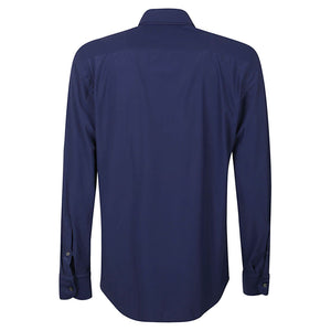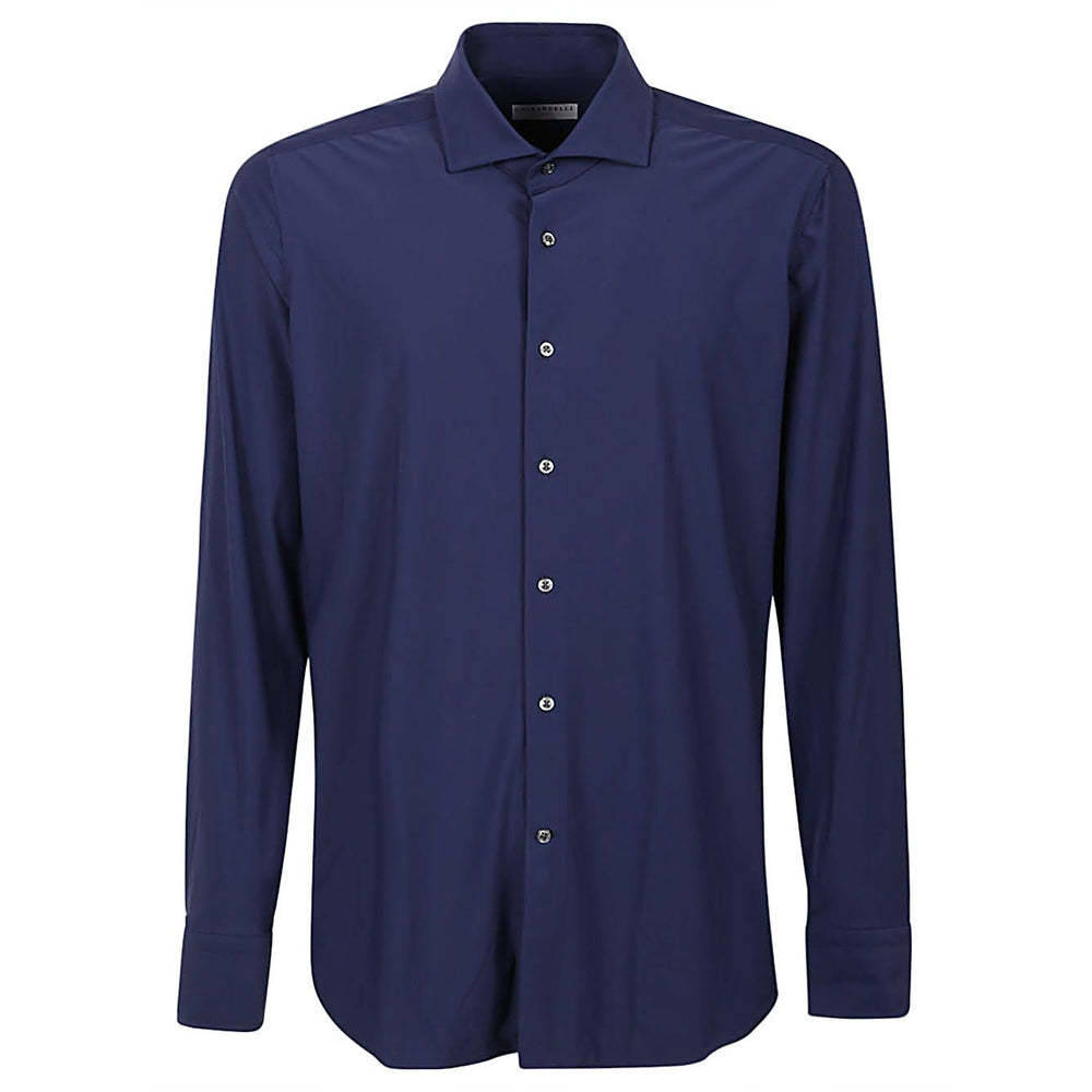 Blue shirt, buttons closure, high collar. Long-sleeves shirt Size and Fit - This piece fits true to size. We recommend you get your regular size. Model is 1,84m / 6ft 1in wearing size 39 (COLLAR CM)