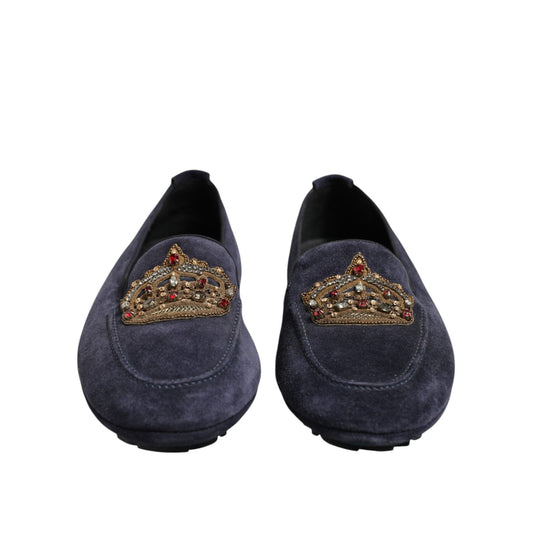 Dolce & Gabbana Blue Suede Crown Crystal Loafers Dress Shoes