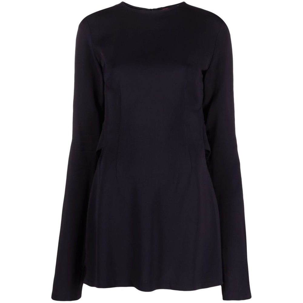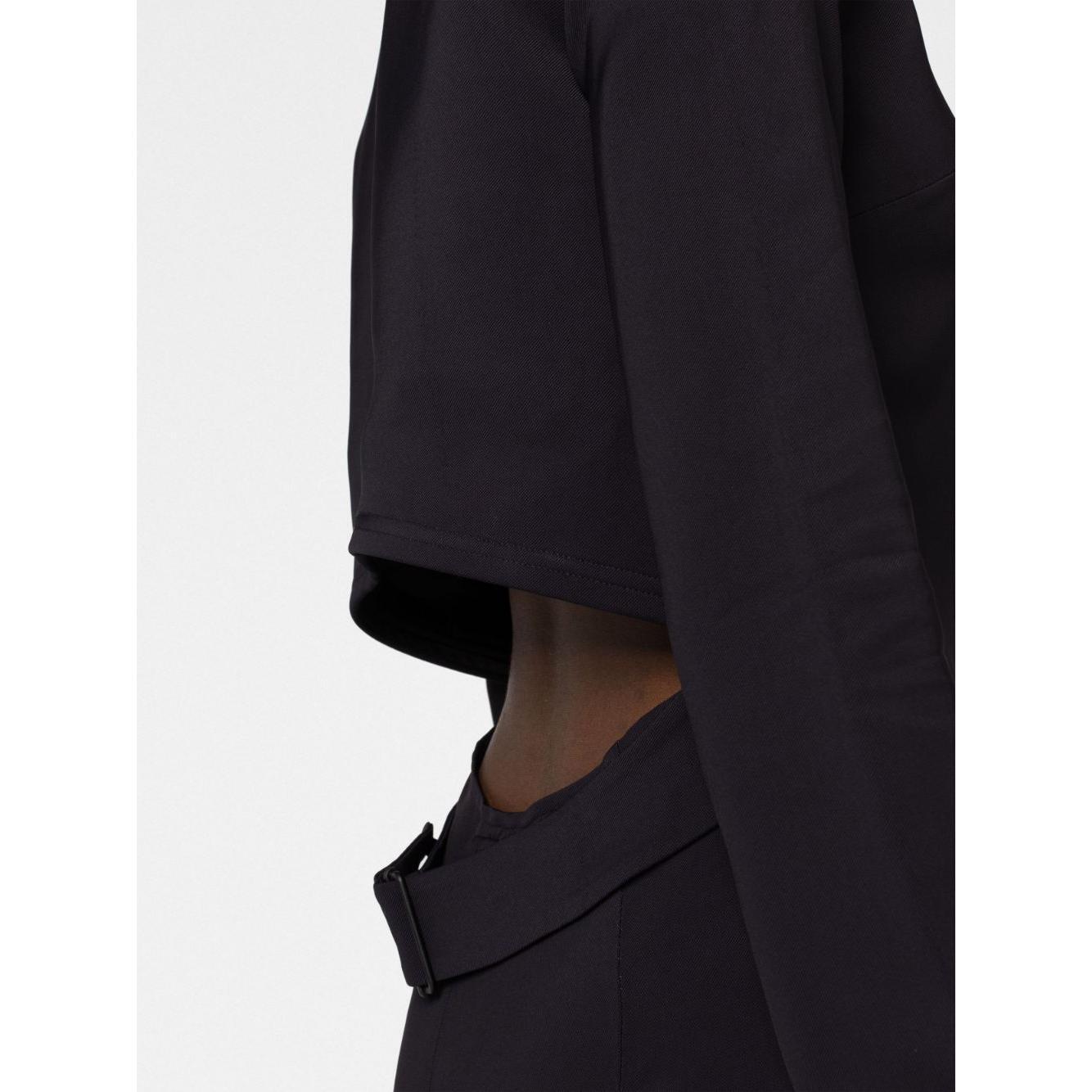 'Kicked Back' structured short dress from 032c featuring black, round neck, rear zip fastening, cut-out detailing, long sleeves and straight hem. Flounced mini dress Size and Fit - This piece fits true to size. We recommend you get your regular size. Model is 1,75m / 5ft 8in wearing size 36 (FR)