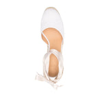 95mm tie-detail platform espadrilles from Castañer featuring off-white, almond toe, rear tie fastening and braided raffia platform. Carina wedge heel espadrilles Size and Fit - Heel 3,5 in / 9 cm; Platform 0,8 in / 2 cm