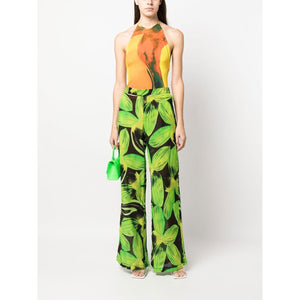 leaves-pattern wide-leg trousers from Louisa Ballou featuring black, bright green, cotton-silk blend, all-over graphic print, high waist, elasticated waistband, two side slit pockets and wide leg. Printed wide leg trousers Size and Fit - This piece fits true to size. We recommend you get your regular size. Model is 1,75m / 5ft 8in wearing size S
